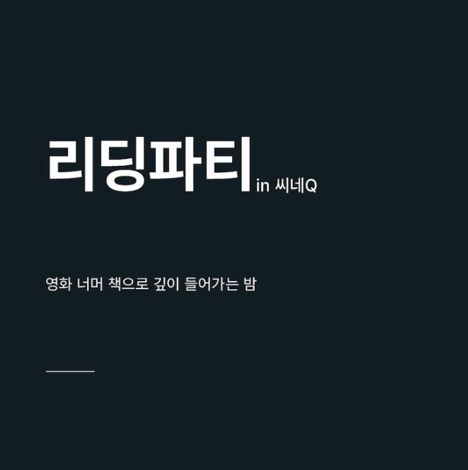 리딩파티 in 씨네Q는 전 좌석 리클라이너와 별도 라운지가 있는 프리미엄 상영관에서 여럿이 모여 각자 책 읽다 함께 이야기 나누는 독서 네트워킹 프로그램입니다.
